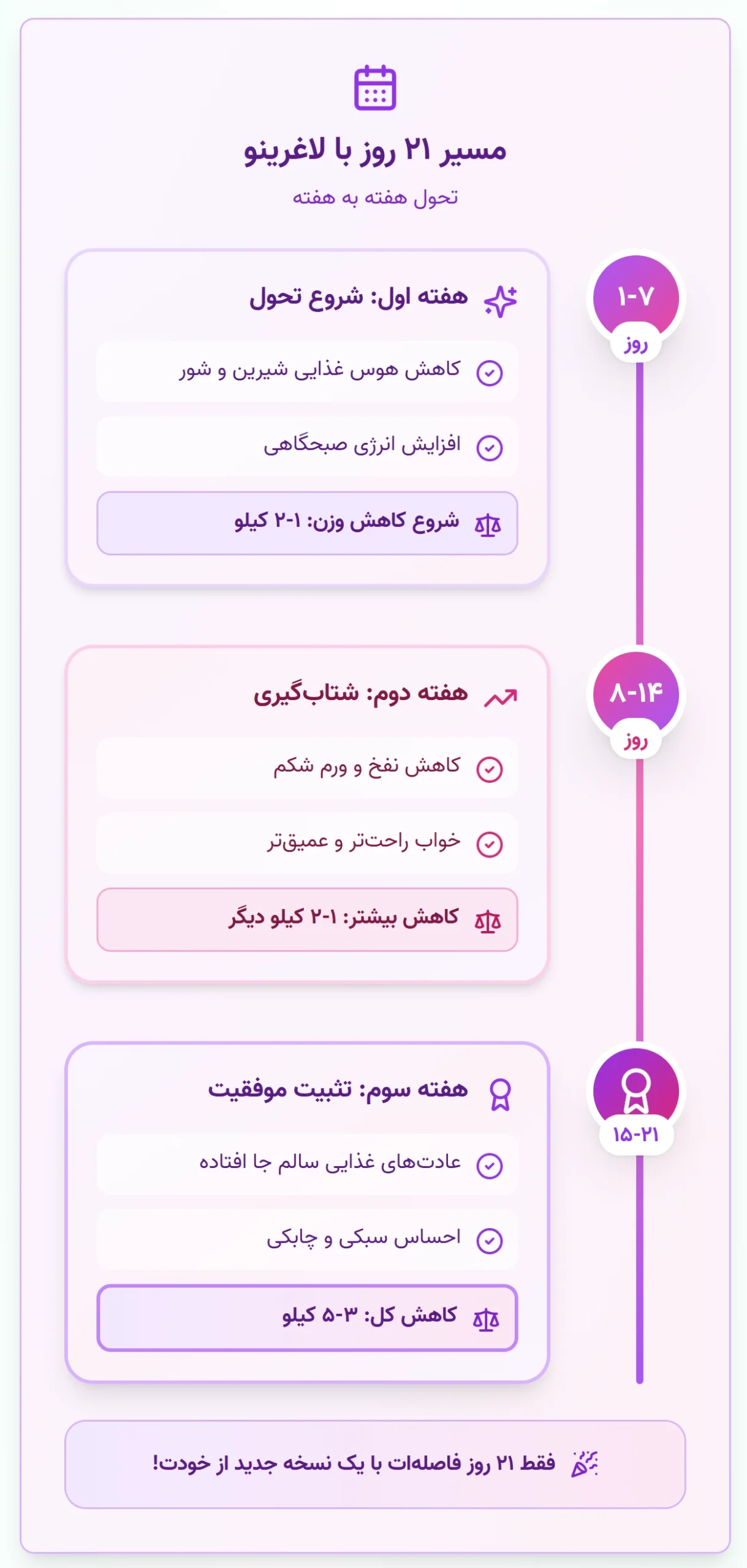 اما «لاغرینو» اصلاً «رژیم» نیست؛ یه «سبک زندگی هوشمند» و «لذتبخش»ـه. ما هیچی رو حذف نمیکنیم. ما بهت یاد میدیم چطور از همون غذای همیشگی لذت ببری (آرزوی لذت)، اما هوشمندانه. «لاغرینو» برای «همیشه» طراحی شده، تا تو بتونی با خیال راحت به اون اندام رؤیاییت برسی و نگهش داری (آرزوی ماندگاری و آرامش).